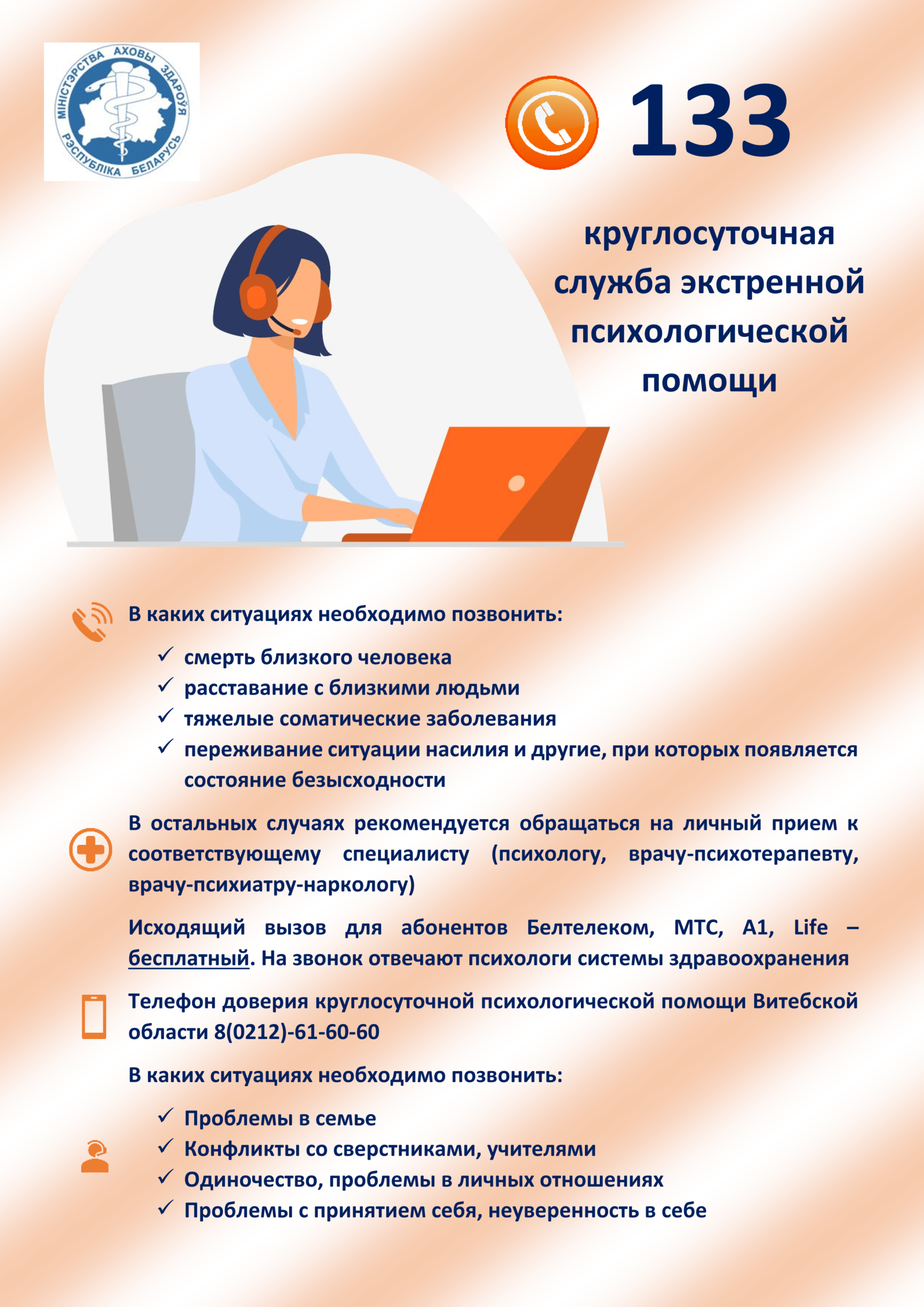 служба экстренной психологической помощи — 8 029 899 04 01. Можно обращаться через мессенджеры Телеграм(Telegram) Вайбер (Viber) Ватсап (WhatsApp), 8 029 899 04 01 (круглосуточно), г. Витебск — 8 0212 61 60 60 (круглосуточно).